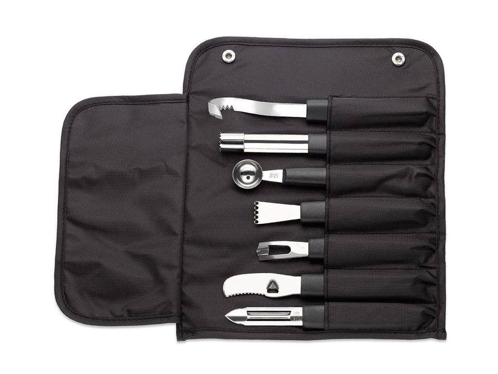 lúpač na citrusy, škrabka na citrusovú kôru lúpanie ovocia alebo zemiakov, nôž na hoblinky z masla alebo tuhých krémov. Nástroje sú bezpečne a prehľadne umiestnené v praktickom pevnom puzdre.