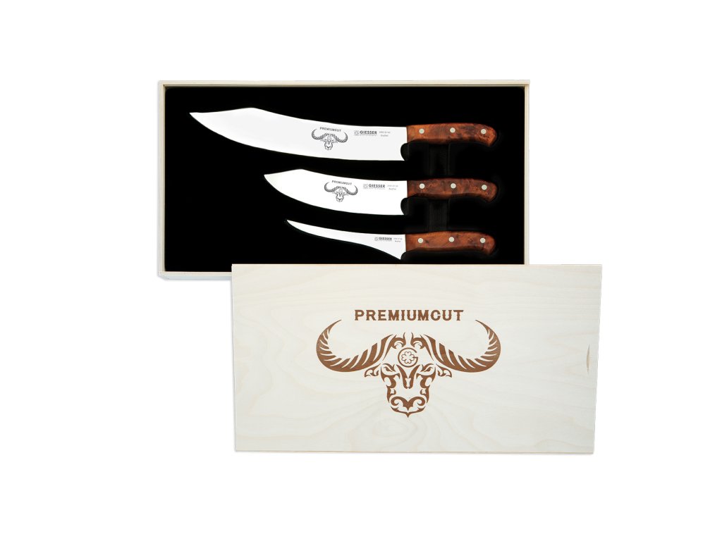 Obsahuje 3 exkluzívne nože nemeckého výrobcu GIESSER, série PREMIUM CUT. Nože sú v dĺžkach 30 cm, 20 cm a 17 cm.