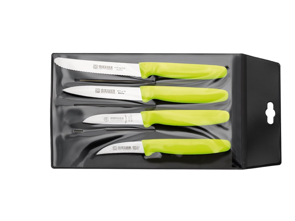 Sada v plastovom puzdre obsahuje štyri nože vhodné na spracovanie zeleniny. Nože sú vybavené plastovou rukoväťou v moderných citrónových farbách: