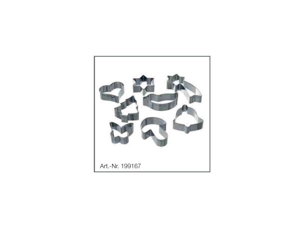 Sada 8 kusov vykrajovačov. Hladké vykrajovače s vianočnými motívmi: zvonček, vianočný stromček, motýlik, kačička, hviezdička, kométa, srdce, hríbik.