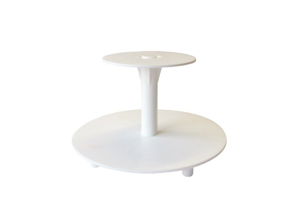 Plastový dvojposchodový tortový podstavec v bielej farbe.