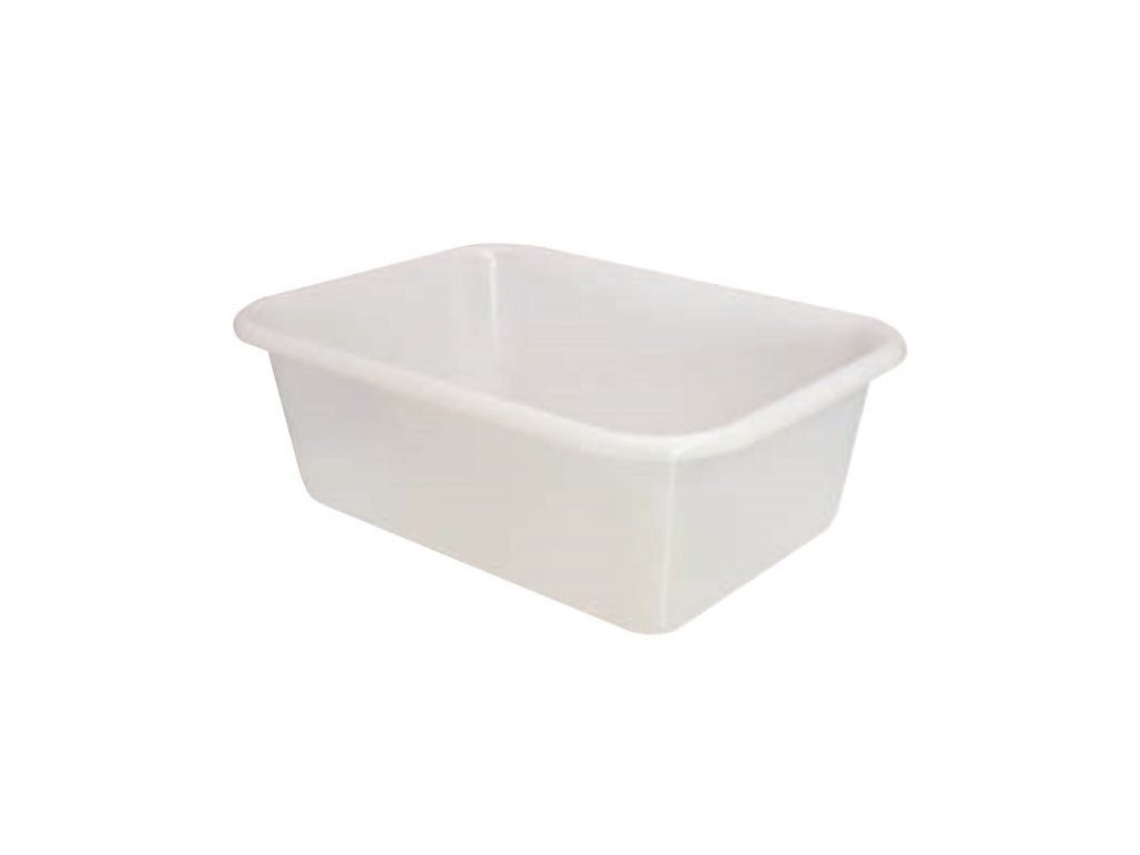 Hranatá nádoba vhodná pre styk s potravinami. Nádoba má bielu farbu.