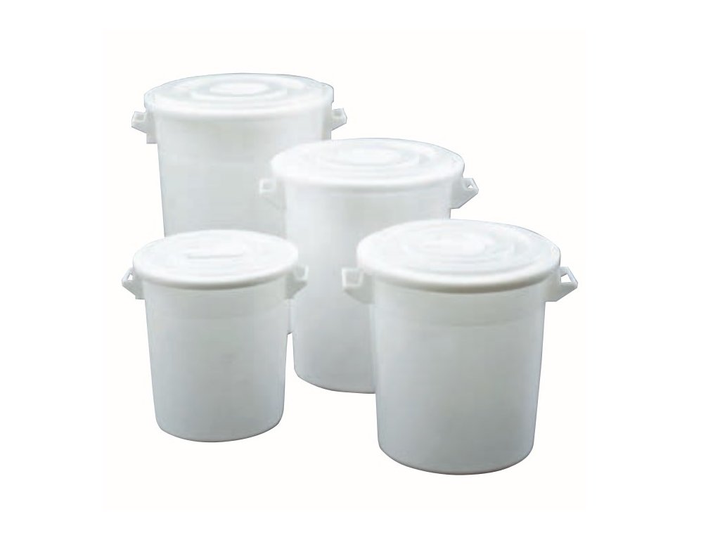 Okrúhla nádoba vhodná na styk s potravinami, vyrobená z HDPE. Nádoba má bielu farbu a dve rúčky pre lepšie uchopenie.